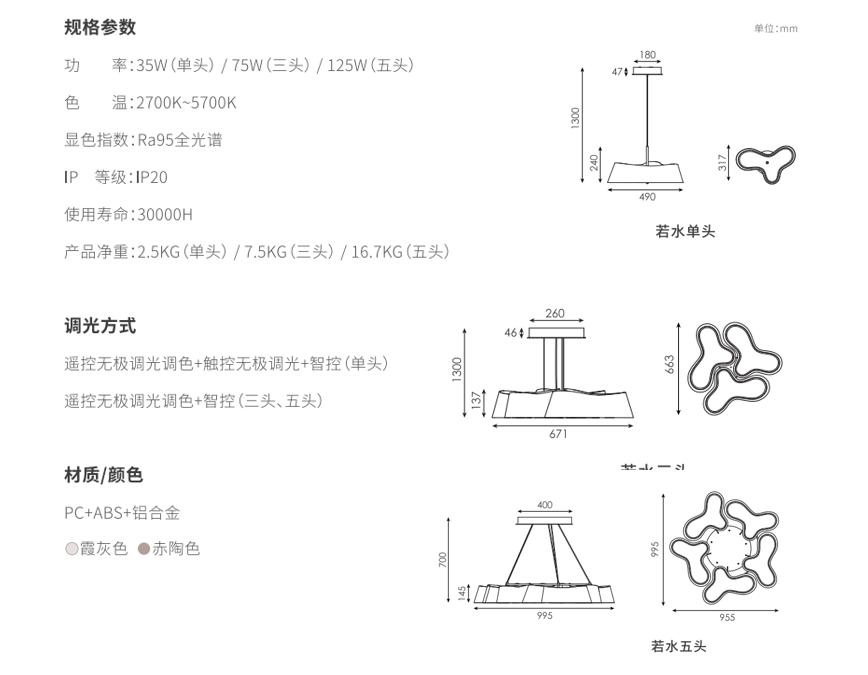 若水吊灯源于中国古典意境中的山水,,外形如山的曲线婀娜蜿蜒,,,,其内侧光晕水波纹,,缓缓晕开;巧妙地将曼妙光影融于山水意境,,,,如空间中悬浮的自然景观,,专门设计调试的水波纹棱面扩散罩可以起到一定的视觉防眩作用,,把原本进入到人眼的杂散光折射掉,,同时可以提升产品的精致品质感;空间光的强功能性和强装饰性通常是个矛盾点,,,,但是若水则取得了一个平衡,,,保证较强光学输出的同时可以有其装饰表现